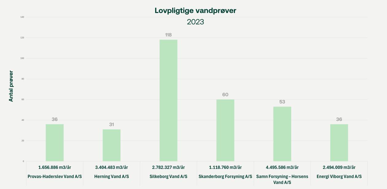 I 2023 udtog vi 118 lovpligtige vandprøver. Herudover tog vi 33 ekstra kontrolprøver i 2023 for at kontrollere vandkvaliteten yderligere.