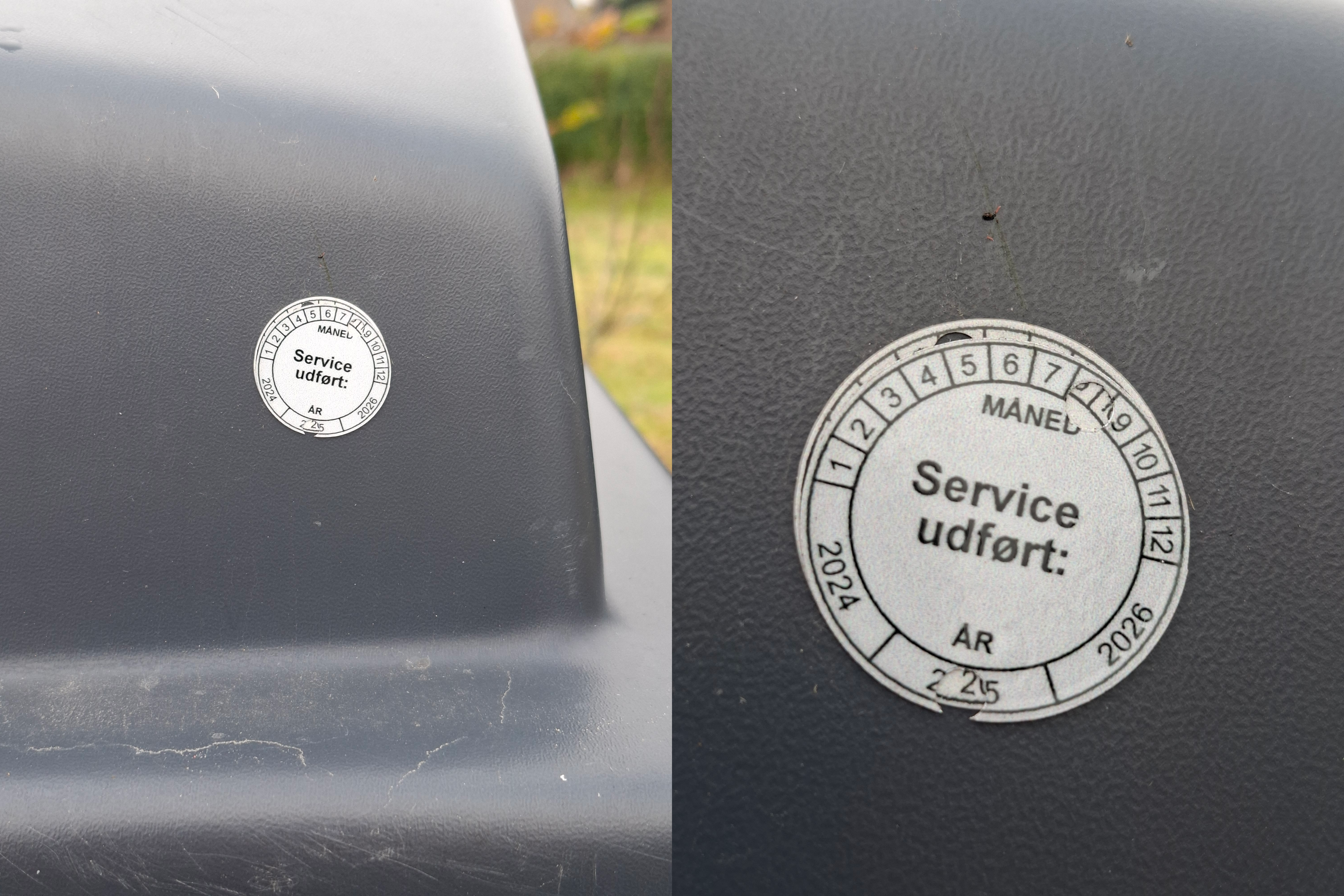 Eksempel på synligt klistermærke på beholderen med dato for seneste eftersyn.