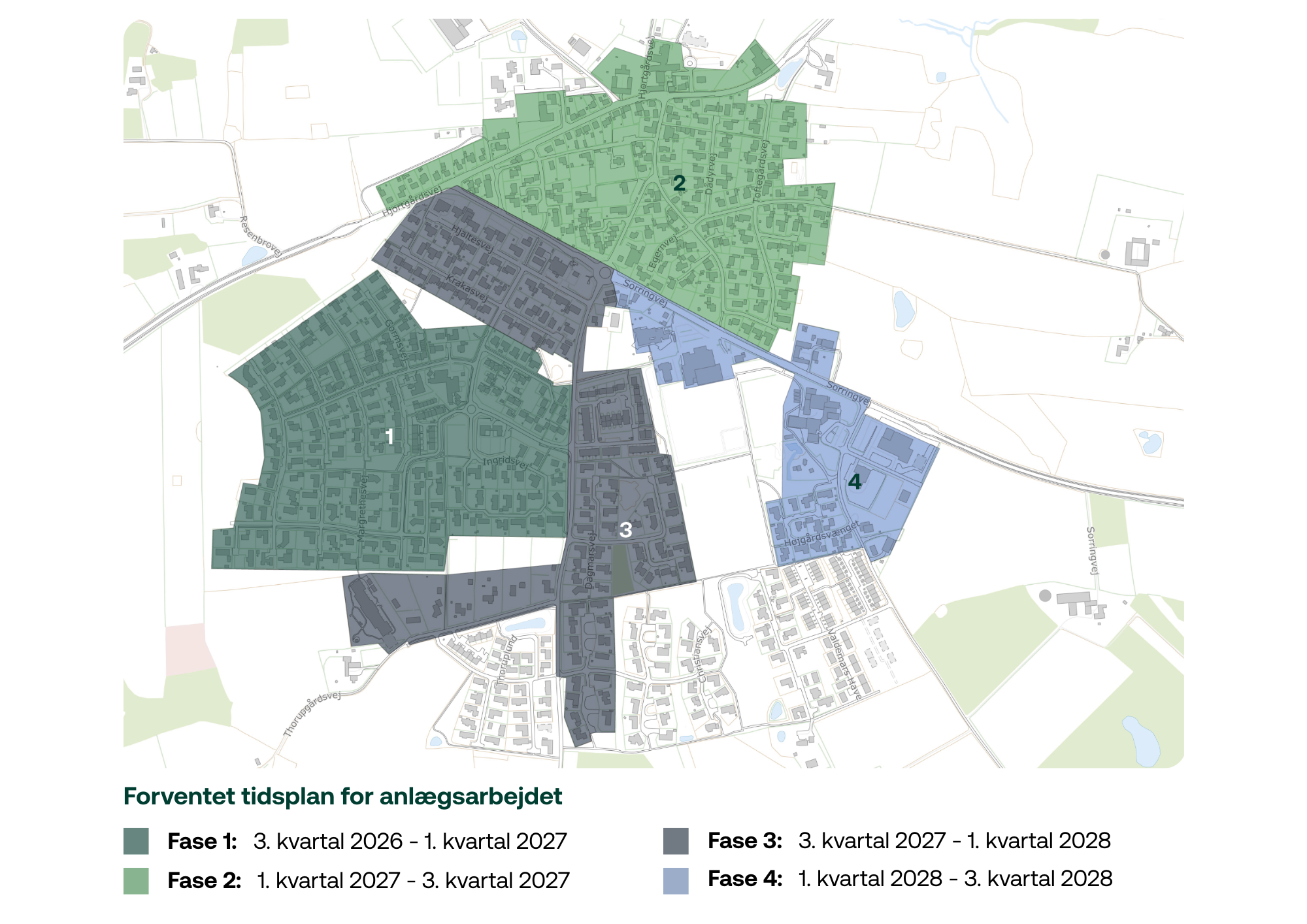 Tidsplanen beskriver, hvordan vi forventer at gravearbejdet forløber. Bemærk, at der kan komme forskydninger blandt andet på grund af vejret (opdateret februar 2026).